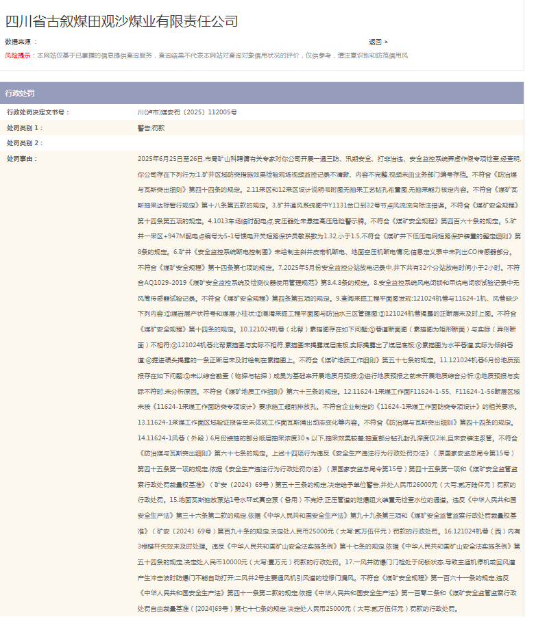 日前,信用中国(四川泸州)公示了四川省古叙煤田不雅沙煤业有限牵扯公司的行政处罚决定。2025年6月25日至26日,泸州市救急贬责局矿山科礼聘联系民众对你公司开展一通三防、汛期安全、打非治违、安全监控系统弄虚乌有专项查验,经查明,该公司存在多项犯警违纪看成,依照关联法律规定开yun体育网,泸州市救急贬责局对其作出告诫,并处东谈主民币86000元罚金处罚。
