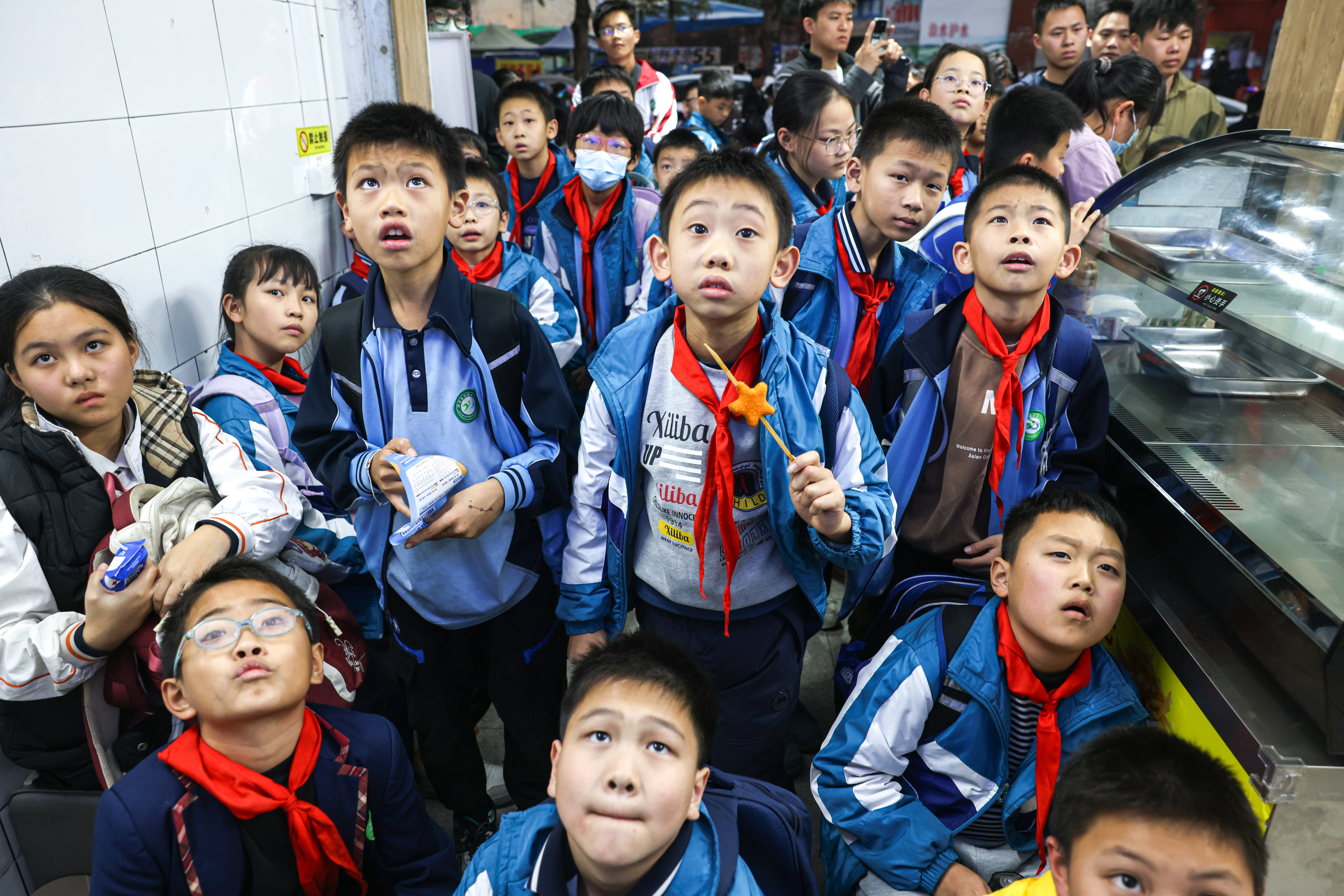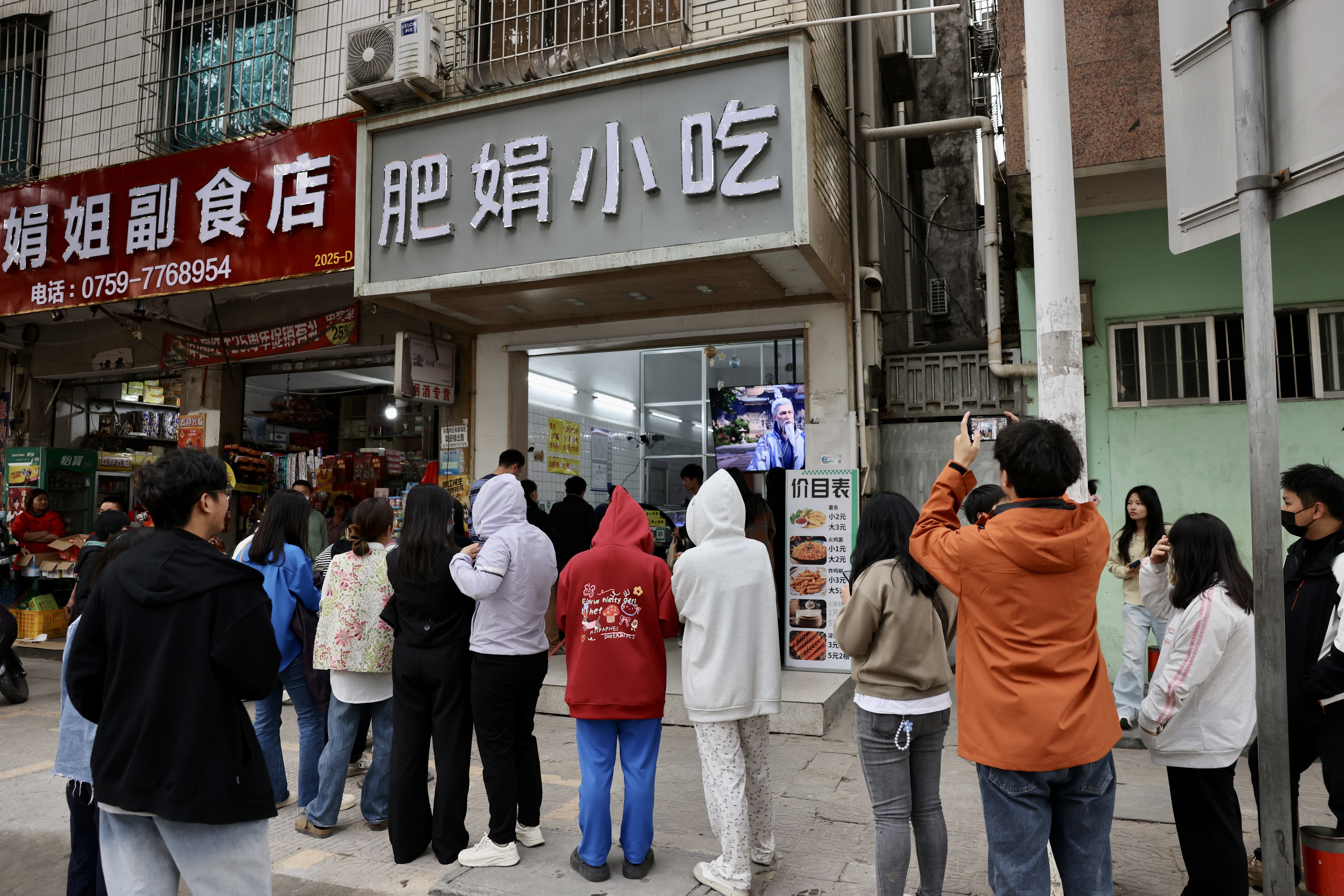 孩子们围在肥娟小吃店里看电视。