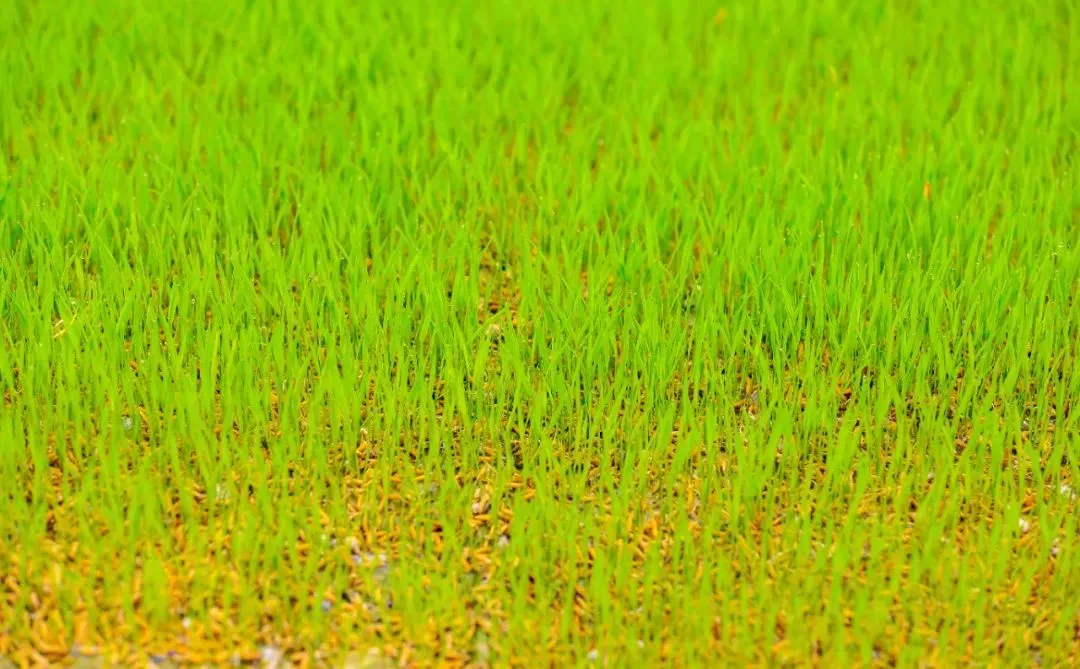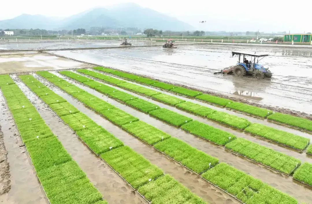 △在肇庆市鼎湖区沙浦镇,耕作户将育秧盆移植水田。肇庆市融媒体中心记者 刘春林 摄