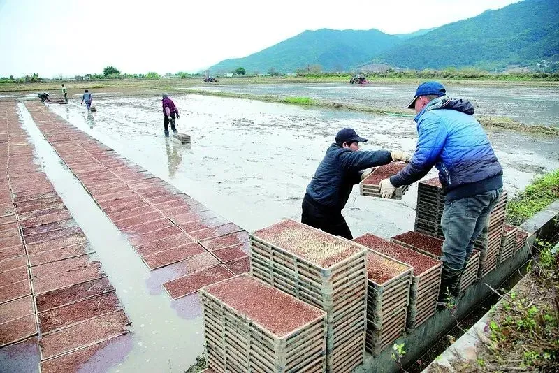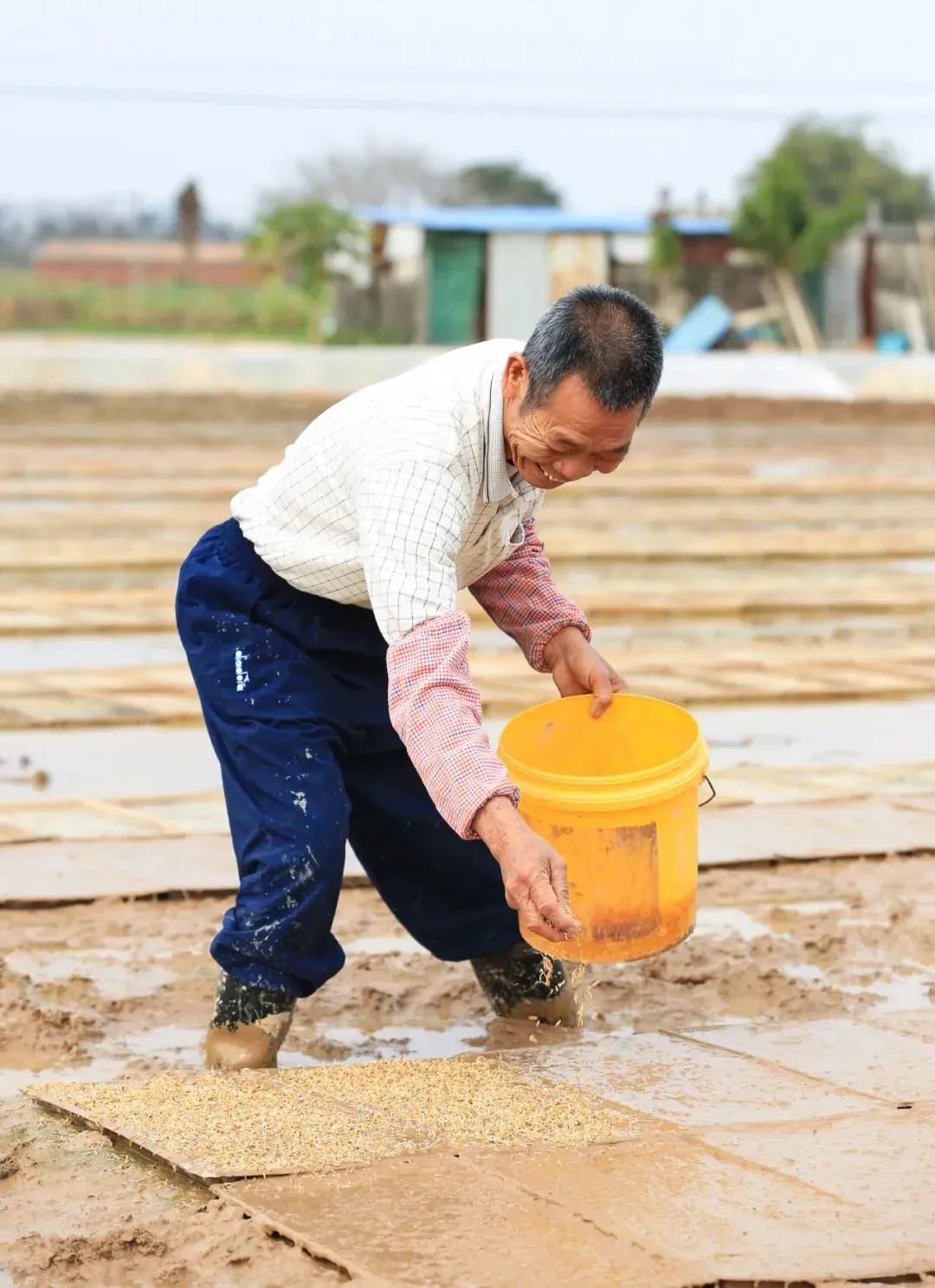 △农户熟习地将稻种均匀地撒在秧盘上,播撒育秧,撒下新一年的但愿。邹华彬 摄